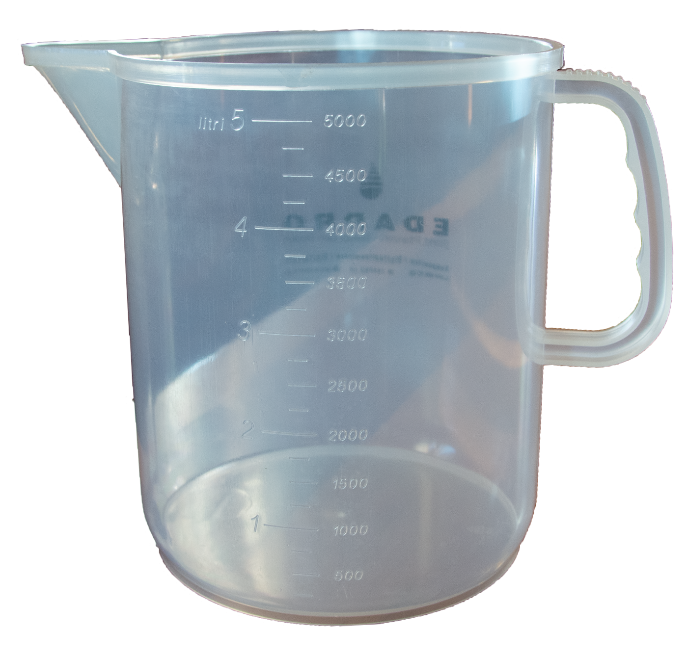 Robuster 5 Liter Messbecher aus transparentem Polypropylen. Mit dauerhaft eingravierter Skala für präzises Abmessen und tropfarmem Ausguss. Hygienisch und vielseitig einsetzbar.